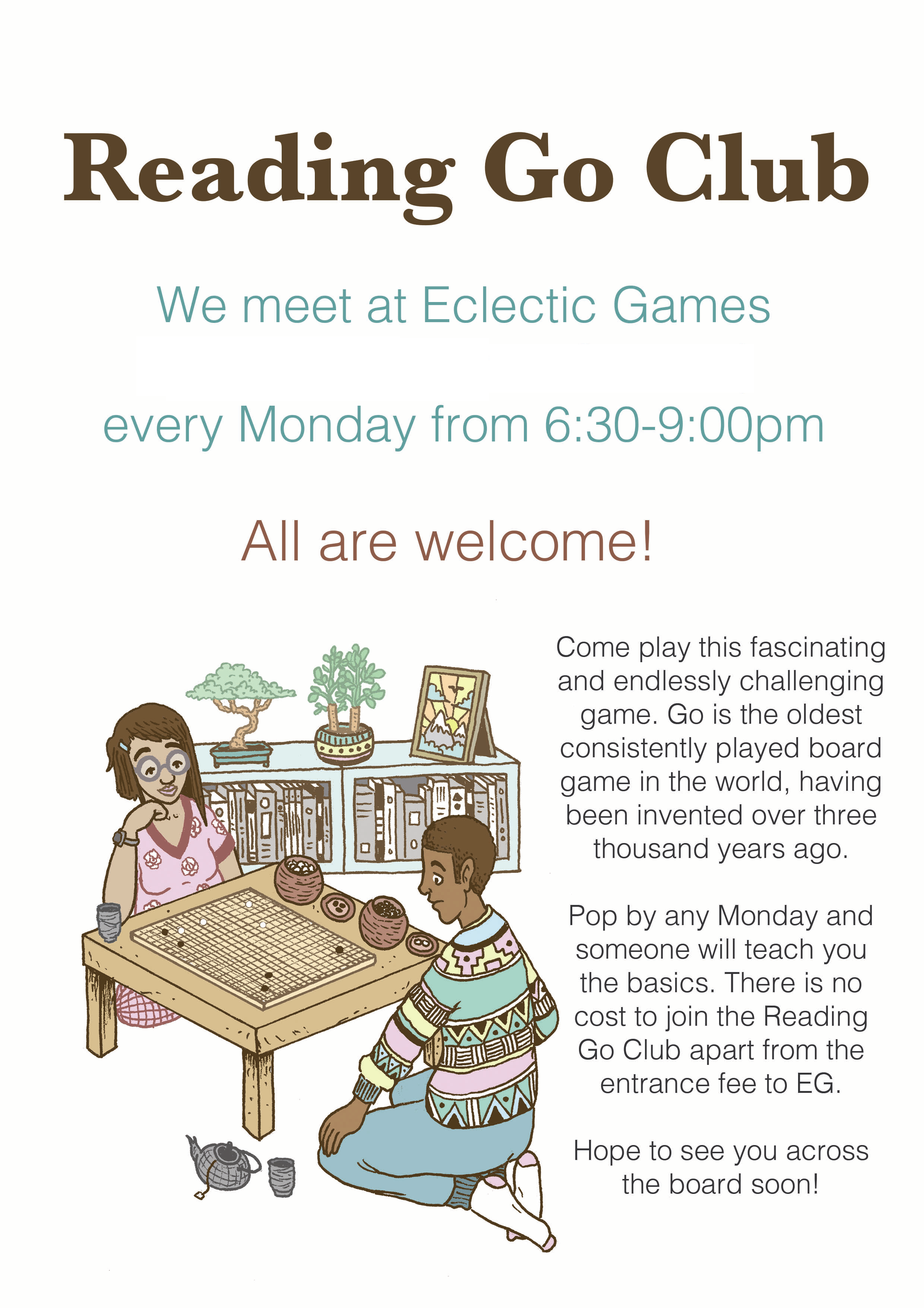 Reading Go ClubAll levels welcome! meets Monday evenings from 18:30** Note new location ** Venue: Eclectic Games21 Duke Street Eclectic Games has moved to 21 Duke Street, On some Mondays, if the shop is shut, we meet online |