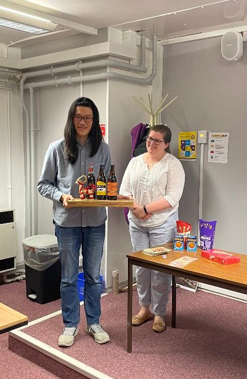 The winner of the Go tournament was Guodong Cao (4d, Oxford University Go Club) who won the coveted Goat Ornament with 5 wins out of 6, shown here receiving prizes from Alice. Prizes were also awarded to Zheng Wang (5d, no club), Leonardo Forchini (6k), and Nicholas Yelland (8k, Durham) who all won 5 games out of 6. Dan Milne (4k Durham) won the small board and lightning side tournaments. Results