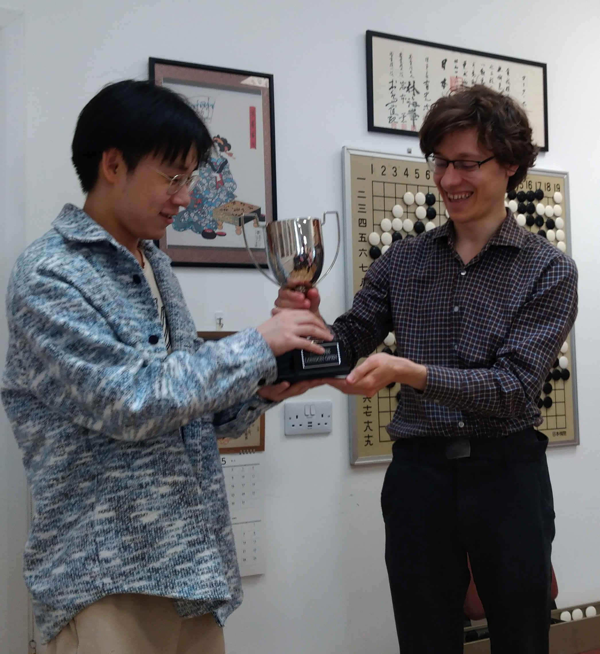 Winning the event with six wins out of six (including "lucky" wins against the 7 dans) was Ziyin Yuan (5d) from China who is currently living in London. He is shown here receiving the trophy from the professional. Second was Yicheng Xiao (7d) with five wins and third was Yuhang Xing (7d) with four wins. Best below-the-bar player was Alistair Wall (2d) and best Single Digit Kyu was Chun Yin Ng (2k) ahead of Ai Guan (1k) and Richard Wheeldon (1k). John McAnally (7k) won five games. The top Double Digit Kyus were Lev Proleev (10k), Angus Macindoe (10k) and Horace Stoica (11k). Yicheng Xiao won the Lightning on the Sunday evening, with runner up Peikai Xue (4d).