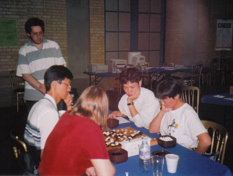 The results started off as expected, but third place was a surprise. This was decided by a play-off against fourth placed Liu Yajie and Liao Xingwen (the result being determined by a half a point and a few clock seconds). Liao was 6 years old and about 4 dan in strength at the time; he was playing with his Go teacher, Yajie, pro 2-dan.